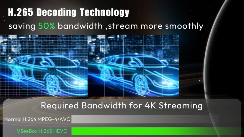 VSeeBox is one of the best-selling TV boxes full of Android. To use our vSeeBox, just plug it into the TV, connect to Wi-Fi or Ethernet, and then you can enjoy the best home entertainment experience ever. The vseebox has a 7-day playback function, so you don’t need to record it yourself. The latest V3 Pro models include: quad-core 64-bit CPU processor, 4GB RAM, 64GB internal storage, Android 11 TV, a new powerful chipset Amlogic 905Y4, supporting 10-bit HDR decoding, up to 8K@60fps, 2R2R dual Wi-Fi 6, up to 867mbps, and LAN network up to 1000mbps.vSeeBox V3 Pro adopts H.265/. Compared with H.264, H.265 image processing technology doubles the data compression ratio under the same video quality, saves 50% of network bandwidth resources, and allows you to watch movies more smoothly with the same image quality and enjoy a high-quality experience with less buffering.
